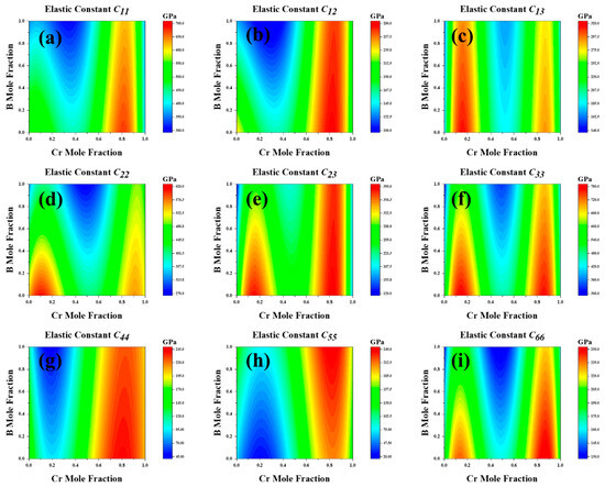 The elastic constants over the whole composition space of cementite-type M3X (M = Fe, Cr; X = C, B). (a) C11, (b) C12, (c) C13, (d) C22, (e) C23, (f) C33, (g) C44 (h) C55, (i) C66.