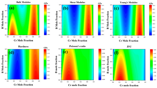 The elastic modulus over the whole composition space of cementite-type M3X (M = Fe, Cr; X = C, B). (a) the bulk modulus (B), (b) shear modulus (G), (c) Young’s modulus (E), (d) hardness (Hv), (e) Poisson’s ratio (v), (f) B/G.