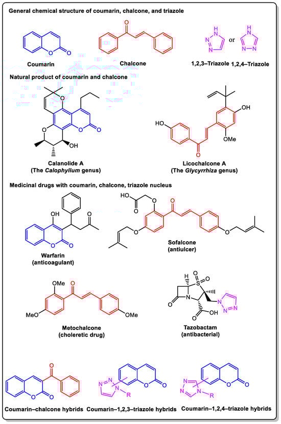 Structures of coumarin, chalcone and triazole and their derivatives.