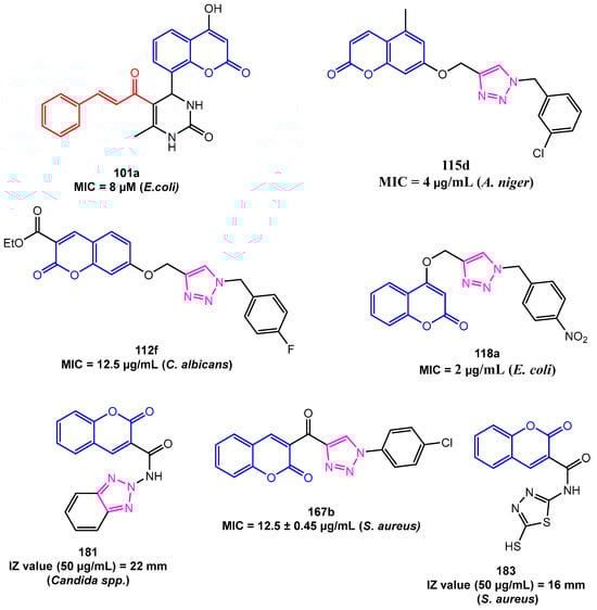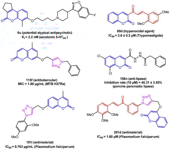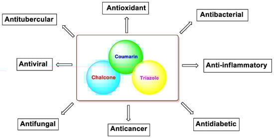 Coumarin derivatives are popular and attractive in the field of medicinal/organic chemistry [58,59,60,61,62,63,64,65,66,67,68]. Hence, several review papers on this topic have been published. For example, Adimule et al. (2022) arranged a recent advance in the one-pot synthesis of coumarin derivatives from different starting materials using metal nanoparticles as heterogeneous catalysts [7]. Song et al. (2020) released an update on coumarin derivatives with anticancer activities by underlining interactions between coumarin derivatives and diverse enzymes and receptors in cancer cells [11]. Additionally, the recent development of coumarin hybrids as antifungal agents was summarized by Hu et al. [14]. Furthermore, an overview of synthetic approaches and the biological activity of coumarin derivatives was provided by Annunziata et al. [67]. The present review focuses on coumarin hybrids. However, it starts with recent developments in coumarin chemistry to give the reader the necessary background and transition needed for the chemistry of coumarin hybrids. We attempt to summarize the synthesis strategies and biological activities of coumarin, coumarin–chalcone and coumarin–triazole hybrids. This review will be beneficial for synthetic and medicinal chemists aiming to develop these hybrids into lead drug compounds.