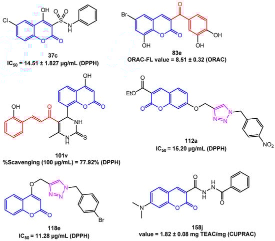 - Alshibl, H.M.; Al-Abdullah, E.S.; Haiba, M.E.; Alkahtani, H.M.; Awad, G.E.; Mahmoud, A.H.; Ibrahim, B.M.; Bari, A.; Villinger, A. Synthesis and Evaluation of New Coumarin Derivatives as Antioxidant, Antimicrobial, and Anti-Inflammatory Agents. Molecules 2020, 25, 3251. [Google Scholar] [CrossRef] [PubMed]