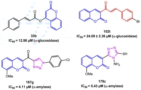 - Hu, C.-M.; Luo, Y.-X.; Wang, W.-J.; Li, J.-P.; Li, M.-Y.; Zhang, Y.-F.; Xiao, D.; Lu, L.; Xiong, Z.; Feng, N.; et al. Synthesis and Evaluation of Coumarin-Chalcone Derivatives as α-Glucosidase Inhibitors. Front. Chem. 2022, 10, 926543. [Google Scholar] [CrossRef]