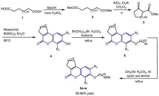 Chen et al. (2014) synthesized several coumarin derivatives starting from dicarboxylic acids 1 (Scheme 1) [68]. Acid 1 was esterified to form ester 2, which underwent cyclization to form 2-carboalkoxcyclohexanone 3. The Pechmann reaction of 3 with resorcinol catalyzed by Bi(NO3)3 afforded compound 4, which was bromoalkylated to form 5. Compound 5 was reacted with various cyclic secondary amines to give amino-functionalized coumarins (6a–w) in medium-to-good yields.