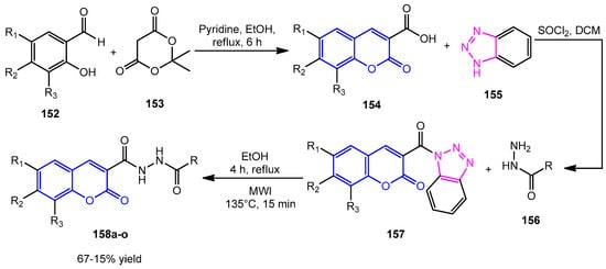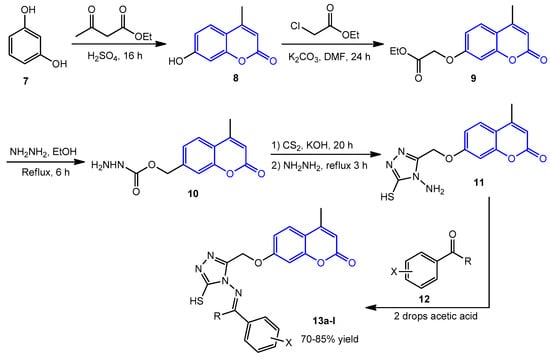 Elbastawesy et al. (2015) constructed twelve novel coumarin derivates, starting from resorcinol 7 (Scheme 2) [69]. After subsequent cyclization, following an SN2 reaction with ethyl chloroacetate and then amidation with hydrazine, compound 10 was obtained which, after further reactions, gave compound 11. From this important intermediate, coumarins 13a–l were obtained in good yields.