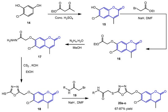 Rasool et al. (2016) converted 4-chlororesorcinol 14 via Pechmann condensation into coumarins 20a–o (Scheme 3) [70]. After Pechmann cyclization, an SN2 reaction of 15 with ethyl 2-bromoacetate, and then amidation, compound 17 was obtained. The derivatization of 17 gave compound 18, which then underwent an SN2 reaction to give coumarins 20a–o in medium-to-good yields.