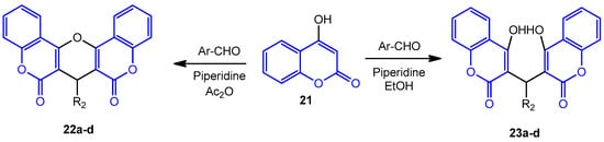 Weng and Yuan (2018) successfully synthesized two types of coumarin (Scheme 4) [71]. 4-Hydroxycoumarin 21 was reacted with aromatic aldehydes via two different conditions to produce compounds 22a–d and 23a–d.