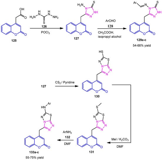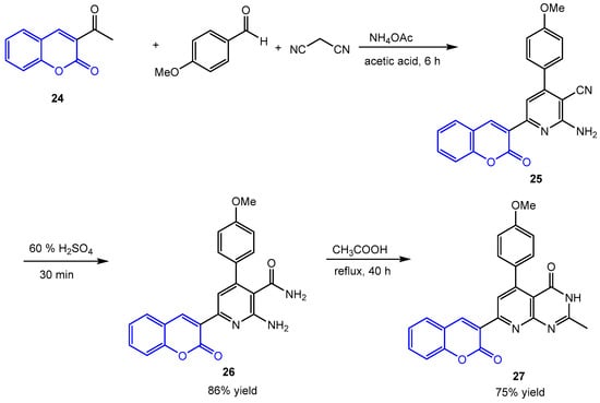 Fayed et al. (2019) synthesized coumarin derivatives through a one-pot reaction of compound 24, 4-methoxybenzaldehyde, and malononitrile to produce intermediate 25 which, upon hydrolysis using 60% H2SO4, gave compound 26 (Scheme 5) [72]. The subsequent cyclization of 26 with glacial acetic acid gave compound 27 in a 75% yield (Scheme 5).
