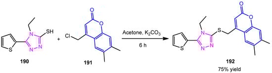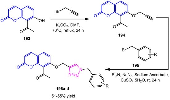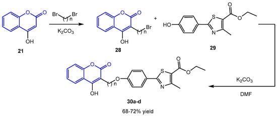 Naik et al. (2019) synthesized four novel coumarin derivatives (Scheme 6) [73]. An SN2 reaction between 4-hydroxycoumarin 21 and dibromoalkane gave intermediate 28 which, upon another SN2 reaction with 29, provided coumarins 30a–d in medium yields.