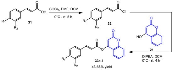 Xu et al. (2020) converted carboxylic acid 31 into cinnamoyl chlorides 32 which, upon reaction with compound 21, gave coumarin derivatives 33a–i in medium yields (Scheme 7) [74].