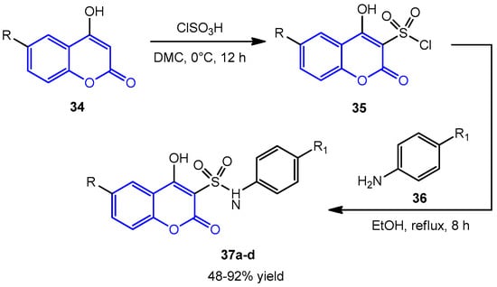 Alshibl et al. (2020) synthesized coumarin derivates via Knoevenagel condensation between 34 and chlorosulfonic acid to produce coumarin sulfonyl chloride 35, which underwent an SN2 reaction with p-substituted aniline 36 to give coumarin-3-sulfonamides 37a–d in medium-to-excellent yields (Scheme 8) [75].