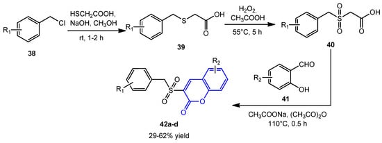 In line with the development of coumarin derivatives, Wang et al. (2020) synthesized 3-substituted coumarin derivatives via a three-step synthetic route from substituted benzyl chlorides/bromides 38 (Scheme 9) [76]. The starting materials 38 were treated with mercaptoacetic acid in the presence of sodium hydroxide to give benzylmercaptoacetic acid 39 which, upon treatment with hydrogen peroxide, gave benzylsulfonylacetic acid 40. Finally, the target compounds 42a–d were synthesized via a Knoevenagel reaction between 40 and substituted salicylaldehydes 41 and were obtained in low-to-medium yields.