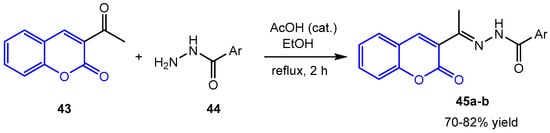 Abduljabbar and Hadi (2021) synthesized coumarin derivatives 45a–b via the acetic acid-catalyzed reaction between 3-acetyl coumarin 43 and hydrazides 44 (Scheme 10) [77].
