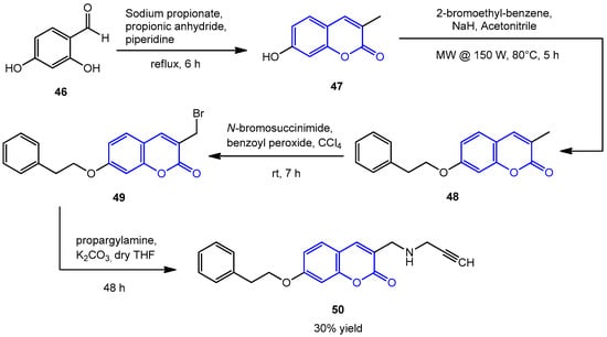 Mzezewa et al. (2021) initiated the synthesis of 3,7-substituted coumarin with a Pechmann condensation of dihydroxybenzaldehyde 46 to give compound 47, which, upon esterification with 2-bromoethylbenzene, gave 48 (Scheme 11) [78]. The subsequent bromination of 48 with N-bromosuccinimide gave 49 which, upon reaction with propargylamine, gave coumarin 50.