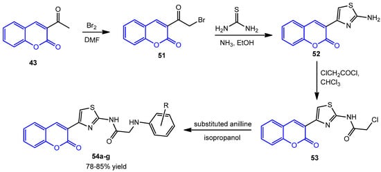 Kokat and Jadhav (2022) constructed coumarin derivatives 54a–g (Scheme 12) [79]. The bromination of 3-acetyl coumarin 43 gave 51, which, upon cyclization with thiourea and then an SN2 reaction on the amino group, gave 53. Finally, an SN2 reaction between substituted anilines and compound 53 resulted in the formation of the target coumarins 54a–g in good yields.
