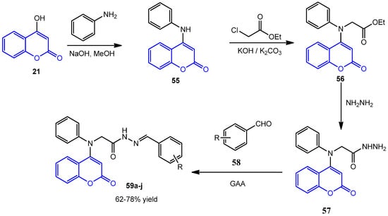 Yadav et al. (2022) synthesized 4-anilinocoumarins in four steps (Scheme 13) [80]. At first, compound 55 was prepared via the reaction of aniline with 4-hydroxycoumarin 21. Next, 55 was treated with ethyl chloroacetate in the presence of KOH/K2CO3 to give the N-alkylated product 56. The reaction of this intermediate with hydrazine hydrate yielded the desired hydrazide compound 57, which, upon condensation with aromatic aldehydes 58, gave 4-anilinocoumarins 59a–j in good yields.