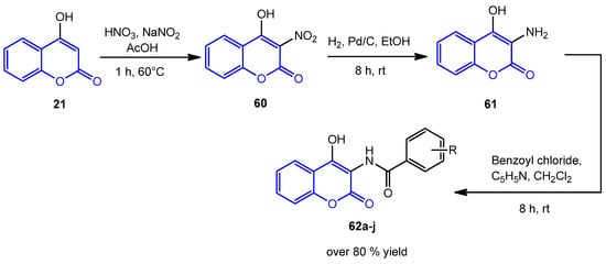 With the same purpose of developing coumarin derivatives, Zhou et al. (2022) converted 4-hydroxycoumarin 21 to nitro product 60 (Scheme 14) [81]. The subsequent reduction of the nitro group gave the amino compound 61, which underwent substitution with various acid chlorides to form the target compounds 62a–j in good yields.