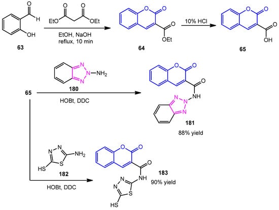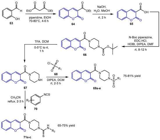Ghouse et al. (2023) synthesized 3-substituted coumarin derivatives, starting from salicylaldehyde 63 (Scheme 15) [82]. A reaction between salicylaldehyde 63 and diethyl malonate gave compound 64 which, upon hydrolysis with sodium hydroxide, yielded compound 65. The amidation of 65 with N-Boc piperazine in the presence of EDC·HCl, HOBt, and DIPEA gave 66. Deprotection of the Boc group using TFA led to the formation of compound 67. The reaction of 67 with various benzenesulfonylchlorides 68 yielded sulfonamides 69a–e in good yields. On the other hand, 67 underwent a reaction with phenylisothiocyanates 70 to give carbothioamides 71a–c in good yields.