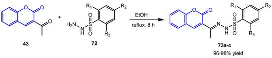 To obtain coumarin derivatives 73a–c, Prathap and Lokanath (2018) performed a condensation between 3-acetyl coumarin 43 and substituted benzene sulfonyl hydrazides 72 (Scheme 16) [83].