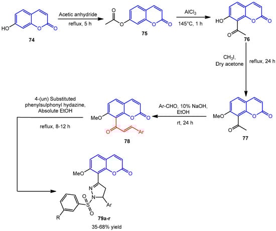 Several research groups successfully attempted the synthesis of coumarin–chalcone molecular hybrids using different approaches. The synthesis of the novel coumarin–chalcone hybrid 78 was accomplished by Amin et al. (2013) (Scheme 17) [84]. The synthesis of the precursor chalcone 76 started by converting 7-hydroxycoumarin 74 to acetylated coumarin 75, followed by acetylation/deacetylation to give 76. The methylation of 76 gave compound 77. The aldol condensation of 77 with various aromatic aldehydes gave coumarin–chalcone 78. These compounds can be further functionalized to 79a–r by reaction of 78 with 4-(un)-substituted phenylsulfonyl hydrazines.