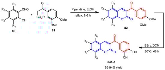 Vazquez-Rodriguez et al. (2013) synthesized hydroxy-3-benzoylcoumarins by initially reacting salicylaldehyde 80 with ethyl 3,4-dimethoxybenzoylacetate 81 to form the Knoevenagel product methoxy-3-benzoylcoumarins 82, which, upon hydrolysis, gave the target hydroxyl-3-benzoylcoumarins 83a–e in medium-to-good yields (Scheme 18) [85].