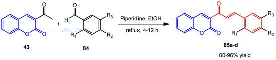 Rodríguez (2015) synthesized coumarin–chalcone derivatives through a two-step process, starting with the preparation of 3-acetyl coumarin 43 via a Knoevenagel reaction. The final coumarins 85a–d were obtained through a Claisen–Schmidt condensation between 43 and aromatic aldehydes 84, giving good-to-excellent yields (Scheme 19) [86].
