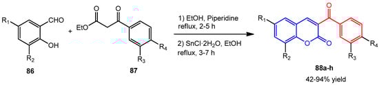 Vazquez-Rodriguez et al. (2015) synthesized coumarin–chalcone derivatives by reacting salicylaldehyde 86 with substituted ethyl benzoylacetate 87 via a Knoevenagel reaction to give derivatives 88a–h (Scheme 20) [87]. In the preparation of amino-substituted derivatives, the same strategy was applied to obtain nitro-substituted 3-benzoyl coumarin precursors, which were further processed without purification using SnCl2·2H2O. The target compounds 88a–h were obtained with moderate-to-excellent yields.