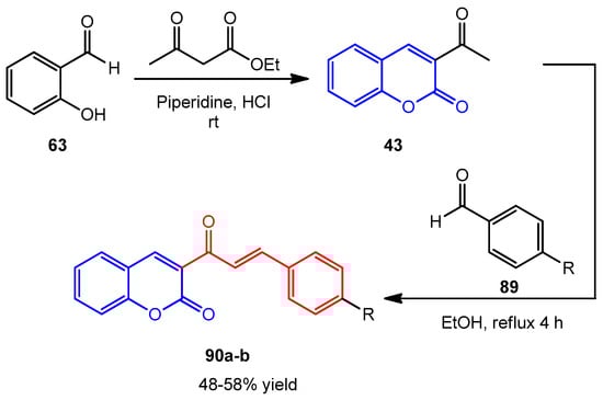Patil et al. (2019) synthesized coumarin–chalcone derivatives by reacting salicylaldehyde 63 with ethyl acetoacetate to give compound 43 which, upon reaction with aromatic aldehydes 89, gave the α,β-unsaturated carbonyl compounds 90a–b in moderate yields (Scheme 21) [88].