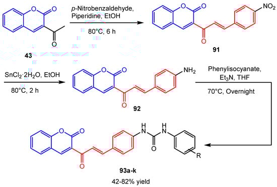 Kurt et al. (2020) synthesized new coumarin–chalcone derivatives (Scheme 22) [89] through Claisen–Schmidt condensation between 3-acetyl coumarin 43 and p-nitrobenzaldehyde to give the desired compound 91, which was then subjected to reduction reaction to give compound 92. Coumarin–chalcone-substituted urea derivatives 93a–k were obtained in moderate-to-good overall yields by reacting 92 with various isocyanates.