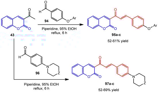 Emam et al. (2021) prepared coumarin–chalcone derivatives via the synthesis route outlined in Scheme 23 [90]. The process involved the Claisen–Schmidt condensation of 3-acetyl coumarin 43 with aryloxybenzaldehydes 94 or dialkylaminobenzaldehydes 96 to give the desired chalcones 95a–c and 97a–c.