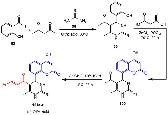 Konidala et al. (2021) synthesized coumarin–clubbed chalcone hybrids as outlined in Scheme 24 [91]. Initially, the acid-catalyzed Biginelli reaction of salicylaldehyde 63 with pentane-2,4-dione and urea/thiourea 98 yielded a dihydropyrimidine derivative 99. Subsequently, the Pechmann condensation of compound 99 with malonic acid formed compound 100. Finally, the base-catalyzed Claisen–Schmidt condensation of compound 100 with various aromatic aldehydes gave the target compounds 101a–z in medium-to-good yields.