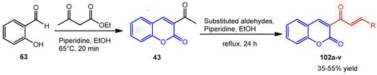 Coumarin–chalcone derivatives were successfully synthesized by Hu et al. (2022) via the reaction of salicylaldehyde 63 with ethyl acetoacetate to give 3-acetyl coumarin 43; then, subsequent aldol condensation with various aldehydes gave coumarin–chalcone derivatives 102a–v in moderate-to-good yields (Scheme 25) [92].
