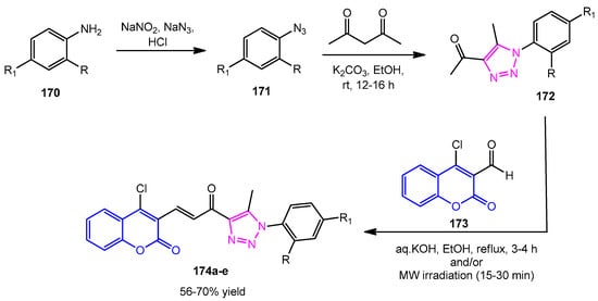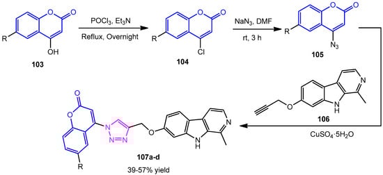 Coumarin–triazole syntheses were reported from various starting materials. Pavić et al. (2021) synthesized coumarin–triazole hybrids, by initially chlorinating substituted 4-hydroxy coumarin 103 (Scheme 26) [93]. The obtained 4-chloro coumarin 104 was then converted to azides 105. The azide–alkyne cycloaddition was used to produce the target products 107a–d in moderate yields by reacting the azides 105 with the harmine-based terminal alkynes 106.