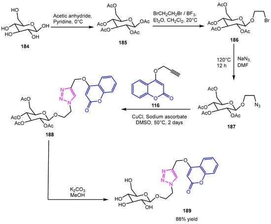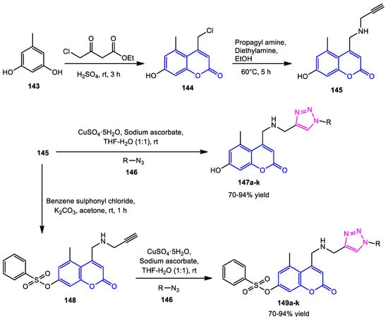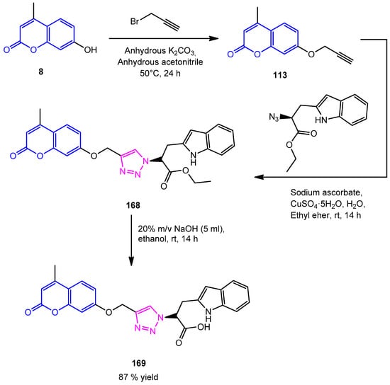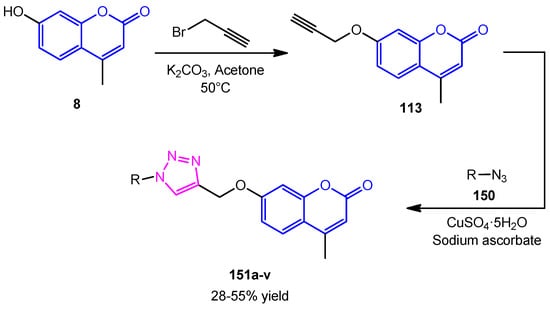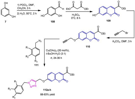 Shaikh et al. (2016) have described the synthesis of a series of new coumarin–triazole derivatives 112a–h from resorcinol 7 (Scheme 27) [94]. Compound 109 was synthesized through the Pechmann condensation between compound 108 and diethyl malonate. The treatment of compound 109 with propargyl bromide resulted in compound 110. Finally, the reaction of benzyl azide 111 and coumarin-based alkyne 110 via click chemistry produced the corresponding coumarin compounds containing 1,4-disubstituted-1,2,3-triazoles 112a–h in excellent yields.