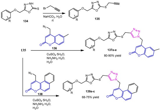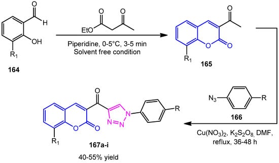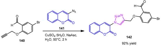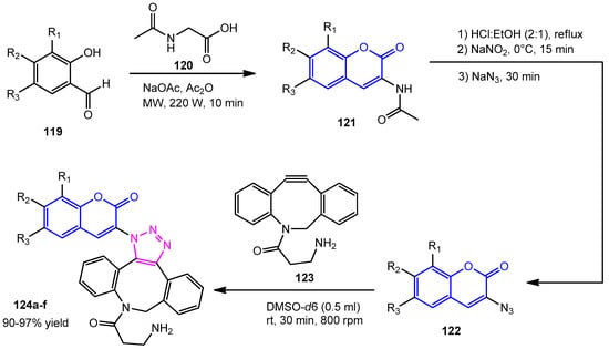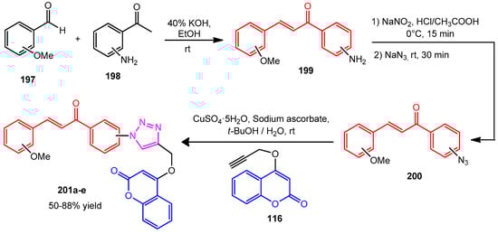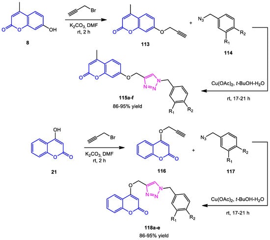 Shaikh et al. (2016) described a protocol for the synthesis of a series of coumarin–triazoles 115a–f and 118a–e from benzyl azides and coumarin-based alkynes via click chemistry (Scheme 28) [95]. The reaction between compounds 8 (or 21) and propargyl bromide produced compounds 113 or 116, respectively. Then, the reaction between 113 and benzyl azide 114 as well as the reaction of coumarin-based alkynes 116 with 117 gave the corresponding coumarin-based 1,4-disubstituted-1,2,3-triazole derivatives 115a–f or 118a–e, respectively, in excellent yields.