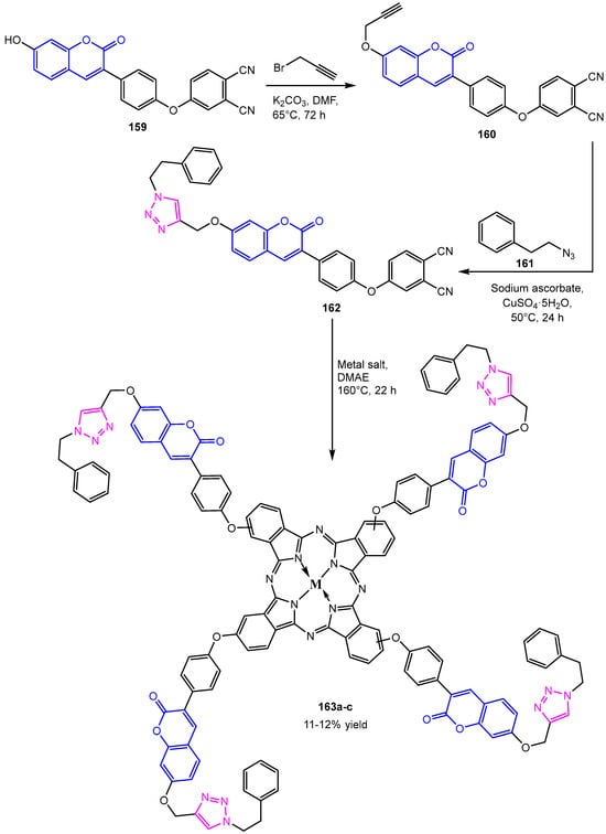 - Özdemir, M.; Abliatipova, A.; Benian, S.; Yalçın, B.; Salan, Ü.; Durmuş, M.; Bulut, M. 1,2,3-Triazole incorporated coumarin carrying metal-free, Zn(II), Mg(II) phthalocyanines: Synthesis, characterization, theoretical studies, photophysical and photochemical properties. J. Photochem. Photobiol. A Chem. 2020, 403, 112845. [Google Scholar] [CrossRef]