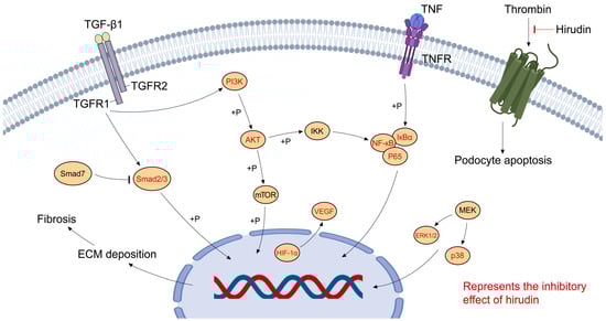 Mitogen-activated protein kinases (MAPKs) are serine/threonine kinases that convert extracellular stimulation into a variety of cellular events, including gene expression, cell proliferation, differentiation, motility, survival, and apoptosis [90]. Hyperphosphorylation of MAPK molecules ultimately activates the nuclear factor (NF)-κB and subsequently produces inflammatory molecules [91]. The p38-MAPK and NF-κB pathways play a pivotal role in the progression of CKD involving inflammation. A study found that hirudin could inhibit inflammation and podocyte apoptosis by regulating the p38 MAPK/NF-κB pathway, ultimately resulting in the protection of renal function and reducing renal pathological changes [73]. Another study showed that hirudin has the potential to diminish microangiopathy associated with nephropathy in rats with DN by inhibiting the p38MAPK/NF-kB signaling pathway [74]. To sum up, the p38 MAPK/NF-κB signaling pathway may function as a central mediator of inflammation in diabetic nephropathy.