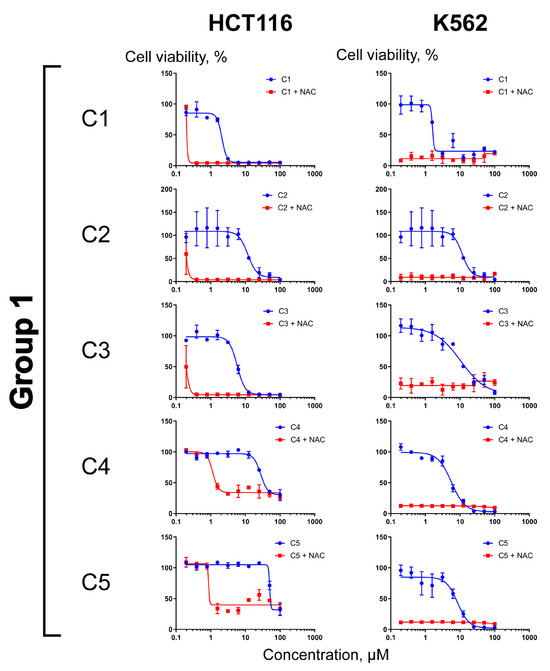 Previously, we have demonstrated that the reduction of Cu2+ to Cu1+ by NAC or ascorbate resulted in rapid ROS generation and the death of cells of various tissue origins [4]. These effects were limited to CuO nanoparticles, as well as to some (but not all) Cu(II) organic complexes; neither other tested divalent metals nor copper-free compounds triggered ROS generation in combination with the reducing agents. Nevertheless, the potency of individual Cu(II)–organic compounds to kill cells in combination with the reducing agents differed significantly. One may expect that the electrochemical reduction potential is a key factor that determines the ability of copper-containing compounds to be reduced in the cellular context. To investigate whether the electrochemical parameters of copper reduction in cell-free systems (Figure 2 and Table 1) could be translated to the cytotoxicity, we compared the effects of NAC on the sensitization of HCT116 colon carcinoma and K562 leukemia cell lines to C1–C11. These models were chosen arbitrarily based on the cell line panel in [4]. Each compound was tested at 0.1–100 µM (twofold serial dilutions) in the absence or presence of 1 mM NAC. At this concentration, NAC alone had no effect on cell viability within 72 h (this study and Ref. [4]). As shown in Figure 3, NAC significantly sensitized both tested cell lines to the nontoxic concentrations of C1–C5. It is worth noting that accurate calculation of the IC50 values was difficult, because doubling of the drug concentration frequently led to an abrupt drop in survival. Such an explosive increase in cytotoxicity in the presence of NAC evidenced that the dependences of cell survival on the drug concentration were nonlinear. We therefore judged cell sensitization on the basis of the ratio IC50 (no NAC)/IC50 + NAC (Table S5). The sensitizing efficacy of (or fold sensitization by) NAC for C1–C5 (group 1) was estimated as two to three orders of magnitude. The K562 cells were exceptionally sensitive to the combinations (Figure 3).