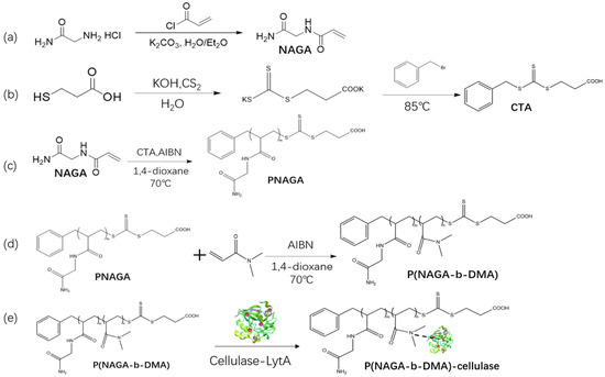 Figure 1. Synthesis process of P(NAGA-b-DMA)-cellulase. (a) Synthesis process of NAGA. (b) Synthesis process of CTA. (c) Synthesis process of PNAGA. (d) Synthesis process of P(NAGA-b-DMA). (e) Synthesis process of P(NAGA-b-DMA)-cellulase.