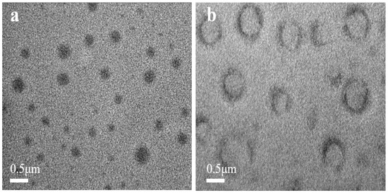 Observations were made on polymer solutions above or below the UCST temperature using transmission electron microscopy (TEM), as depicted in Figure 2. At temperatures higher than the UCST, the polymer exhibits spherical black nanoparticles with diameters of 200–400 nm. When the temperature falls below the UCST, the polymer nanoparticles have a diameter of approximately 1000 nm and display a black outer ring with a white interior. This is because of the disruption of hydrogen bonds within the polymer molecules at high temperatures, causing the expansion of the polymer chains and allowing for the phosphotungstic acid solution to penetrate into the entire polymer structure, resulting in its black appearance. When the temperature is below the UCST, the polymer forms intramolecular hydrogen bonds, causing the polymer chains to contract tightly, greatly increasing the hydrophobicity. Water-soluble phosphotungstic acid cannot penetrate into the interior of the polymer molecule and can only cover its surface. Therefore, at this time, a black outline can be observed on the surface of the polymer, but the interior is not stained or blackened. At this juncture, the augmentation in particle size can be attributed to the development of a polymer framework structure influenced by hydrogen bonds, similar to the phenomenon that ice is larger than liquid water [33,34].