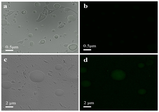Characterization of P(NAGA-b-DMA)-cellulase. Cellulase was labeled with fluorescein isothiocyanate (FITC), and the fluorescence of the polymer and immobilized enzyme before and after the immobilization reaction was observed at an excitation wavelength of 288 nm through a laser confocal microscope to evaluate the effectiveness of the immobilization. The test results of the laser confocal microscope are depicted in Figure 3. In the bright field, numerous spherical particles can be observed in P(NAGA-b-DMA) (Figure 3a), while these particles exhibit minimal fluorescence in the dark field (Figure 3b). In the bright field, the diameter of the spherical particle in P(NAGA-b-DMA)-cellulase increases nearly fivefold (Figure 3c), and the entire sphere displays a consistent green fluorescence (Figure 3d). This demonstrates that cellulase can be stably immobilized on P(NAGA-b-DMA). However, the average molecular weight of LytA-labeled cellulase is approximately 90,000.00 g/mol, which is much higher than the molecular weight of the polymer (15,000–25,000 g/mol). Nonetheless, considering the enzyme’s immobilization capacity, it can be deduced that the polymer content in the immobilized enzyme is notably greater than that of the enzyme alone. Therefore, the primary reason for the increase in the particle sizes of the immobilized enzymes is not due to enzymes themselves, but rather because each enzyme simultaneously undergoes affinity reactions with multiple polymer molecules, resulting in multiple polymer molecules being linked together by a small amount of cellulase molecules, forming a large molecular cluster of immobilized enzymes. Furthermore, the inclusion of cellulase in the immobilization procedure notably elevates the molecular weight of the entire molecular assembly. This contributes to enhancing the UCST of the polymer [39,40].