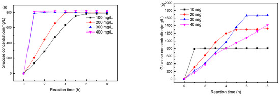 Productivity analysis of immobilized cellulases: In this experiment, the yield of the whole reaction process under the optimal catalytic condition was measured by the productivity curve to evaluate the catalytic effect of the immobilized enzyme on the free enzyme [47]. A total of 10 mg of finely crushed qualitative filter paper was introduced into 10 mL of immobilized enzymatic solution, with concentrations ranging from 100 to 400 mg/L. The catalytic reaction was carried out at 50 °C and pH = 6 for 8 h, with the glucose concentration in the solution measured every hour to evaluate the catalytic effect. The experimental findings are illustrated in Figure 5a, revealing that augmenting the quantity of the immobilized enzyme has minimal impact on the reaction limit but significantly enhances the rate of the catalytic reaction. When the mass ratio between the immobilized enzyme to substrate is greater than or equal to 3:10, the reaction can be completed within one hour.