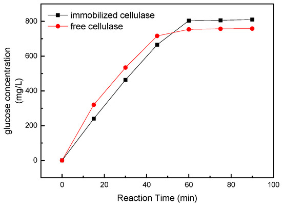 Under the above optimal catalytic conditions, the catalytic effects of the free enzyme and immobilized enzyme were compared, and the results are shown in Figure 6. While the free cellulase demonstrated a somewhat higher initial catalytic rate, the difference in performance between it and the immobilized enzyme was indeed marginal. The results were consistent with the kinetic parameters, indicating that the immobilization method had little effect on the catalytic activity of the enzyme. At the same time, although the free enzyme can reach the reaction limit faster, the immobilized cellulase can convert more of the substrate to glucose. This phenomenon may arise from the progressive decline in the catalytic efficiency of the enzyme throughout the course of the reaction. The protection of the carrier material causes the enzyme activity to decline more slowly, and this additional retained catalytic activity converts more substrates [47].