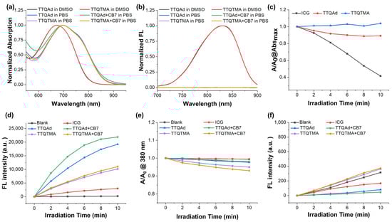 The UV-Vis-NIR absorption spectra and fluorescence emission spectra of TTQAd and TTQTMA in DMSO and phosphate buffer solution (PBS) are shown in Figure 1a,b. Both TTQAd and TTQTMA had a maximum absorption peak at 672 nm in DMSO, benefiting from its D-A-D conjugated structure (Figure 1a). The absorption spectra of TTQAd and TTQTMA in PBS showed an apparent red-shift with a maximum absorption peak at 700 nm, with the tail extending to 900 nm (NIR I region). Both molecules had weak fluorescence in DMSO with an emission peak at 800 nm and fluorescence quenching in the aqueous solution due to the π-π stacking in a poor solvent (Figure 1b). Upon the addition of CB7, there is no significant shift in the peak of the absorption spectra and no significant change in the fluorescence emission spectra. This is due to the long distance between the terminal groups on the side chains and the main chain of the molecule. Therefore, the binding of CB7 to the terminal groups did not affect the optical property of the main chain (Figure 1a,b). In addition, TTQAd and TTQTMA have superior photostability compared to the commercial photosensitizer ICG. After 10 min of exposure to an 808 nm laser, the absorbance of TTQAd and TTQTMA decreased by less than 10%, whereas that of ICG decreased by 60% (Figure 1c).