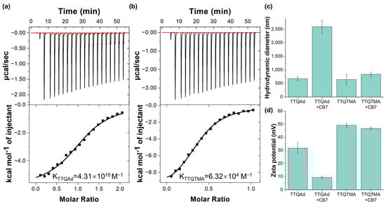 To assess the difference of the self-assembly behavior of TTQAd and TTQTMA with CB7, the isothermal titration calorimetry (ITC) experiments were firstly carried out. As shown in Figure 2a,b, the calculated binding constant for TTQAd with CB7 was Ka = 4.31 × 1010 M−1, while for TTQTMA with CB7, it was determined as Ka = 6.32 × 104 M−1, indicating that the binding ability of TTQAd with CB7 was significantly stronger than that of TTQTMA, consistent with our expectations.