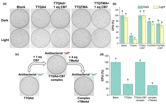(a,b) Photographs of E. coli colonies on agar plates and bacterial viabilities of E. coli treated with TTQAd or TTQTMA (20 μM) before and after the addition of CB7 (40 μM) with/without 808 nm laser irradiation (0.5 W cm−2, 10 min). (c,d) Supramolecular switch of the antibacterial efficacy of TTQAd upon the treatment of CB7 and a subsequent treatment of competing guests TMeAd. TTQAd:CB7:TMeAd = 1:2:8. Different letters (a, b, c) in the bar graphs represent significant difference at p < 0.05 levels.