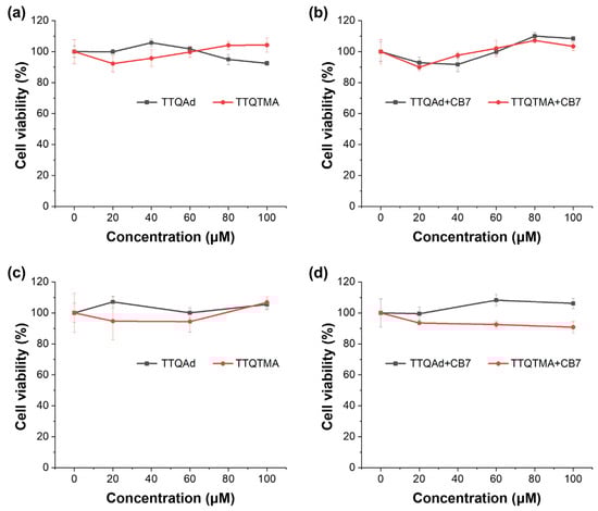 Cell viability after treating with TTQAd (a), TTQTMA (a), TTQAd + CB7 (b), and TTQTMA + CB7 (b) at different concentrations in the absence of light. Cell viability after treating with TTQAd (c), TTQTMA (c), TTQAd + CB7 (d), and TTQTMA + CB7 (d) at different concentrations followed by 808 nm laser irradiation (0.5 W cm−2).