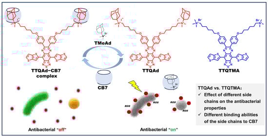 In summary, we have designed and synthesized two conjugated oligoelectrolytes, TTQAd and TTQTMA, which possessed absorption wavelengths that are longer than those of most photosensitizers and the ability to generate ROS when exposed to 808 nm laser irradiation. Due to the different cationic side chains, these two photosensitizers demonstrated varying effects on bactericidal activity. In particular, TTQAd exhibited a stronger dark and light toxicity against E. coli and S. aureus than TTQTMA. Moreover, TTQAd showed a stronger toxicity against E. coli in the absence of light, and against S. aureus in the presence of light, making it possible to selectively combat both bacterial strains under different treatment conditions. Furthermore, benefiting from the cationic adamantaneammonium group on the side chains, TTQAd was more likely to bind to CB7 to shield its cationic terminal groups and prevent direct contact with the bacteria, turning off the antibacterial effect. Consequently, with the introduction of competing guests, TTQAd could be released, restoring its antibacterial effect, and the antibacterial effect is turned on. This design significantly lowered the required concentration of CB7 (1 eq) and the competitive guest (4 eq). Therefore, the selective antibacterial effect against different bacterial strains can be achieved by a rational design of the side chains of the conjugated oligoelectrolytes, and the introduction of guest moieties on the side chains can further allow for the reversible regulation of the antibacterial effect using a host-guest self-assembly strategy. The latter strategy can also effectively prevent a prolonged exposure of the photosensitizers to bacteria, allowing for the controlled release of active photosensitizers, and showing promise in preventing the emergence of drug-resistant bacteria.