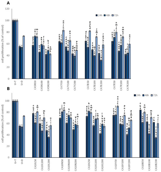 The effect of chickpea sprouts 5 and 7 DAS (A) and 10 DAS (B) in different doses (50, 100, 200 µg/mL; numbers in parentheses) on proliferation of PNT2 cells stimulated by testosterone (U + T) (n = 3). The data from incubation periods of 24 h, 48 h, and 72 h are individually depicted on each bar chart. They are expressed as the mean ± standard deviation (SD) of three experiments. The letters placed above each bar chart express significant differences between the results.