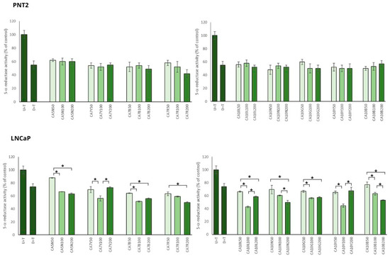 The effects of chickpea sprout extracts 5 and 7 DAS and 10 DAS on 5-α-reductase activity in PNT2 and LNCaP cells stimulated by testosterone. The cells were incubated with extract at different concentrations (50, 100, and 200 µg/mL), with reference drug dutasteride (D + T), or treated only with testosterone (U + T). The results are expressed as the mean ± SD of three experiments. Significant differences (p < 0.05) between tested extract doses are marked by *.