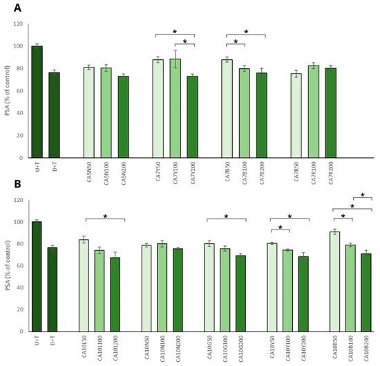 The effects of chickpea sprout extracts 5 and 7 DAS (A) and 10 DAS (B) on PSA release in LNCaP stimulated by testosterone. The cells were incubated with extract at different concentrations (50, 100, and 200 µg/mL), with reference drug dutasteride (D + T), or treated only with testosterone (U + T). The results are expressed as the mean ± SD of three experiments. Significant differences (p < 0.05) between tested extract doses are marked by *.